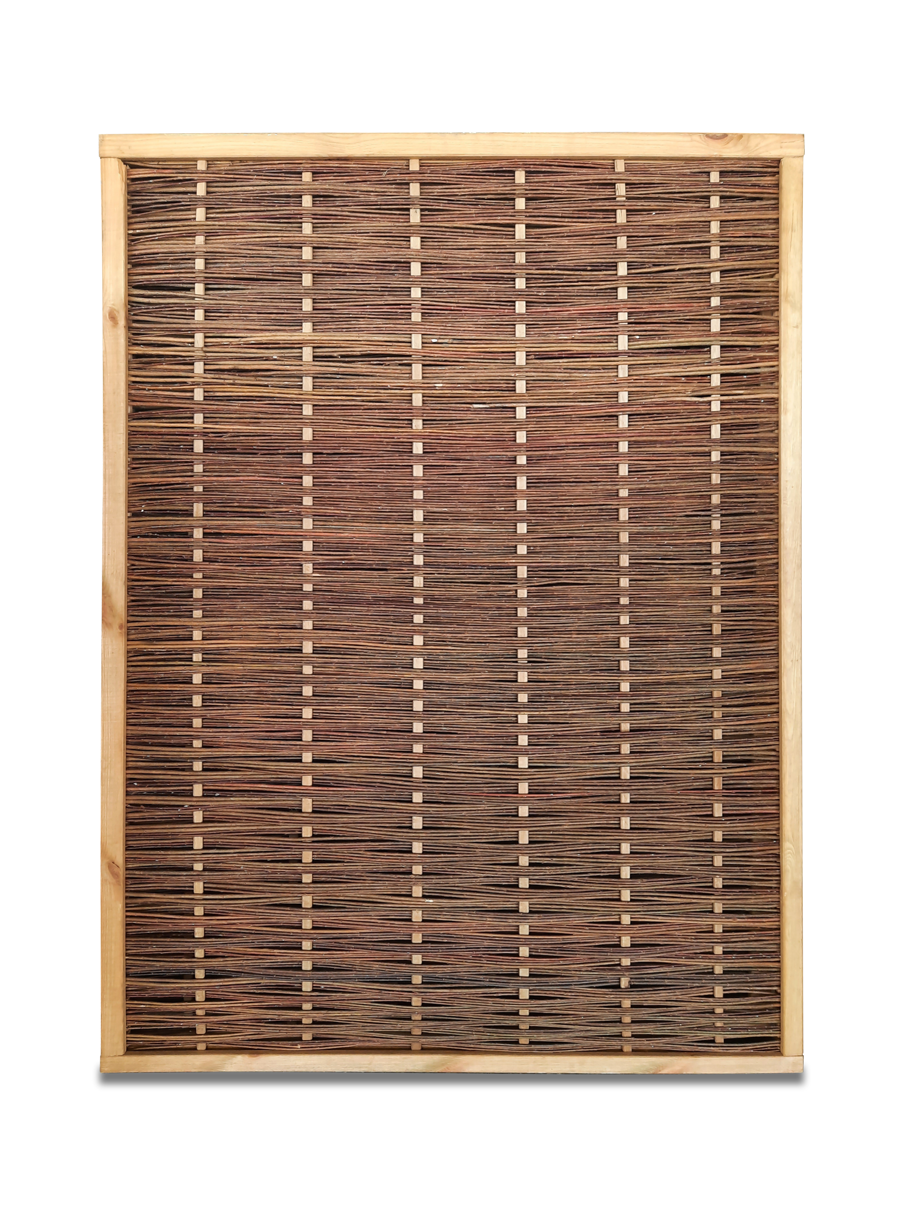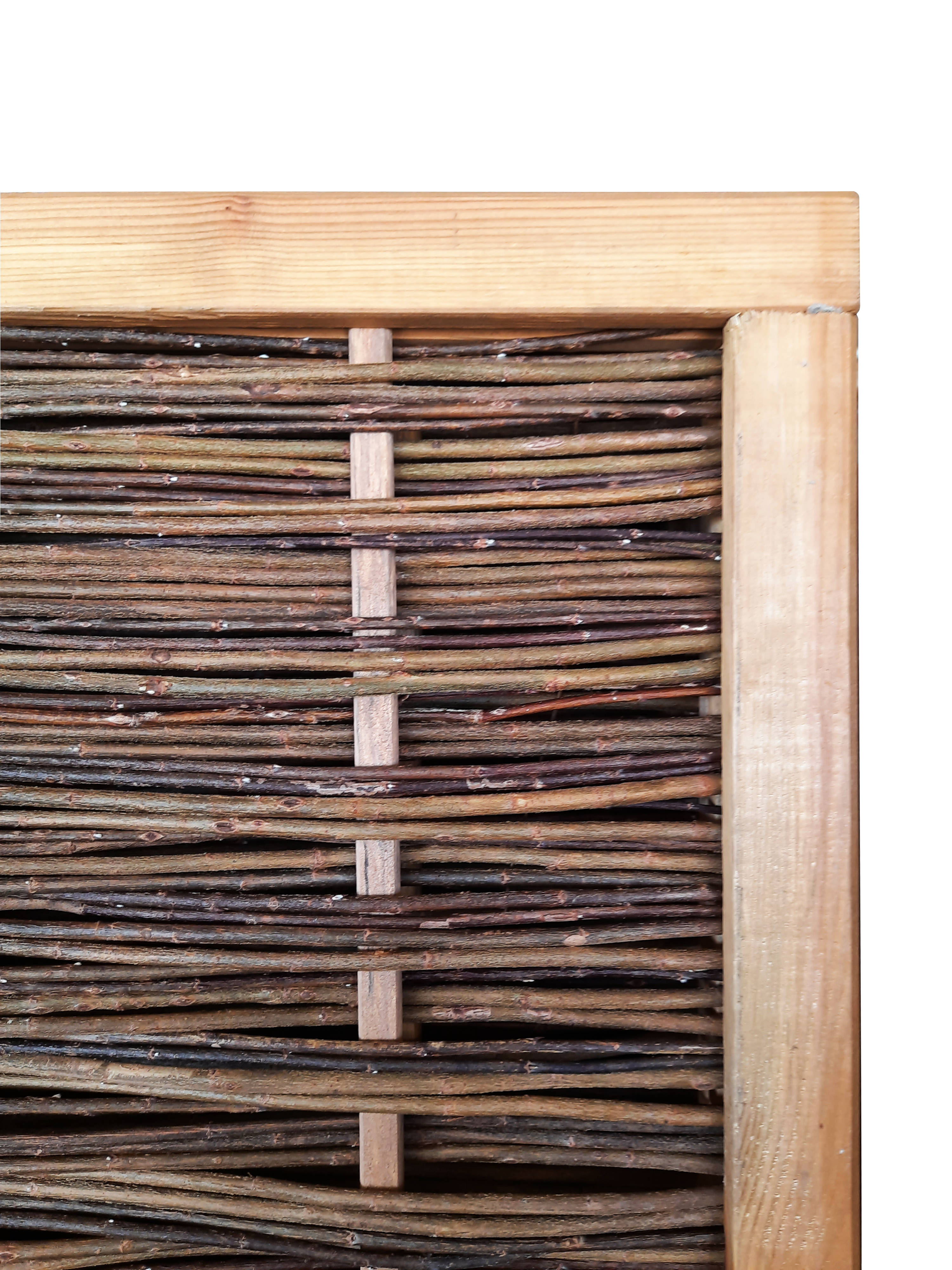 Parawan wykonany jest z mocnej drewnianej ramy, solidnych drążków, a wypełniony gęsto plecioną wikliną.